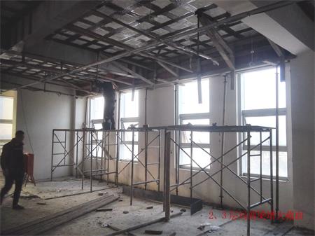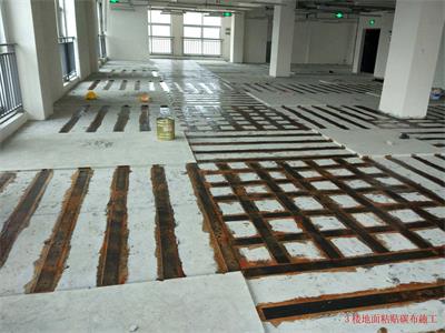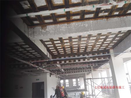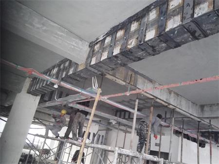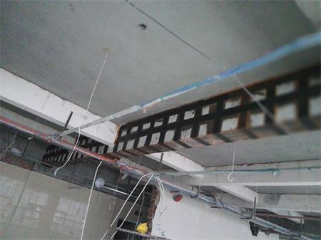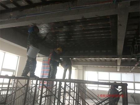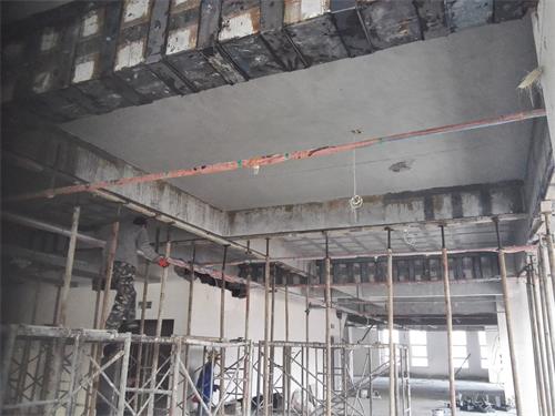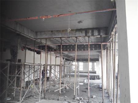 該房屋結(jié)構(gòu)為鋼筋混凝土框架-剪力墻結(jié)構(gòu),由于原二、三樓設(shè)備機房荷載增加,二樓局部不上人屋面增設(shè)多個大型空調(diào)外機導(dǎo)致原結(jié)構(gòu)梁、板承載力不能滿足功能使用要求而進行局部加固改造,按加固圖紙設(shè)計要求包括以下施工內(nèi)容:室內(nèi)安全措施支撐架搭設(shè)(含室內(nèi)成品構(gòu)件保護、局部硬防護、移動活動腳手架及鋼架管、安全網(wǎng)、密目網(wǎng)、安全警示標(biāo)志等其它措施);2~3層樓內(nèi)阻擋部份的建筑物拆除,同時進行建筑垃圾清運;2~3層樓板底高強度碳纖維片材粘貼加固施工;2~3層樓板面高強度碳纖維片材粘貼加固施工;2~3層梁底高強度碳纖維片材粘貼加固施工;2~3層梁頂粘貼鋼板加固施工(包含化學(xué)錨栓植筋分項工程);2~3層梁、板加固部位表面水泥砂漿抹灰施工;屋面變形縫施工;屋面卷材防水施工;屋面剛性層施工;加固范圍內(nèi)原有管道、機電設(shè)備等相關(guān)線路管網(wǎng)成品保護 附施工現(xiàn)場照片